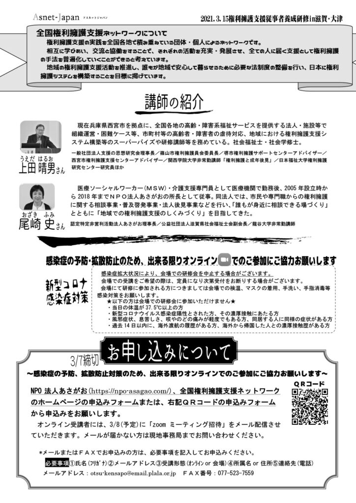お知らせ3/15(月)「権利擁護支援従事者養成研修 in 滋賀・大津」開催のお知らせ