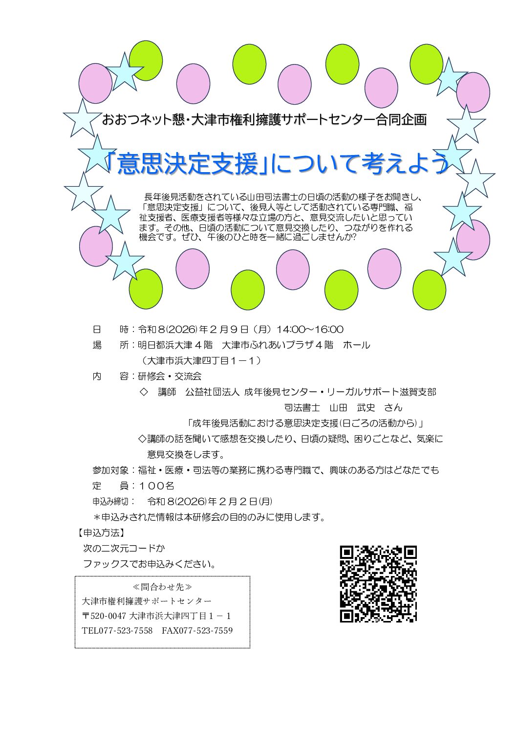 おおつネット懇・大津市権利擁護サポートセンター合同企画 「意思決定支援について考えよう」開催のお知らせ